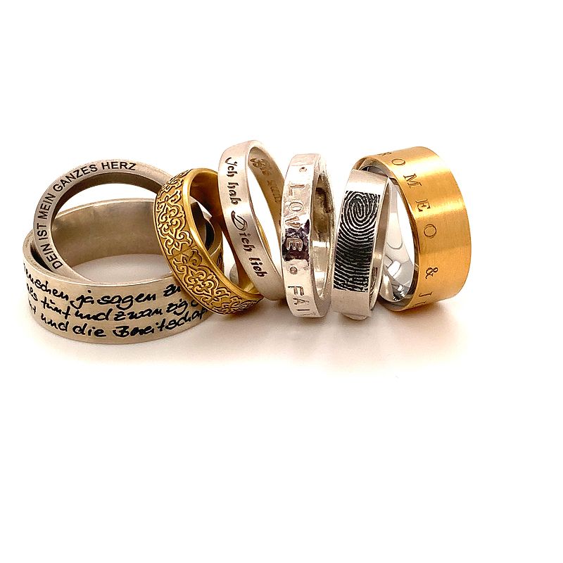Wir gravieren ausschließlich auf metallischen Materialien wie Gold, Silber, Platin und Edelstahl. Diese eignen sich besonders gut für dauerhafte Ergebnisse.